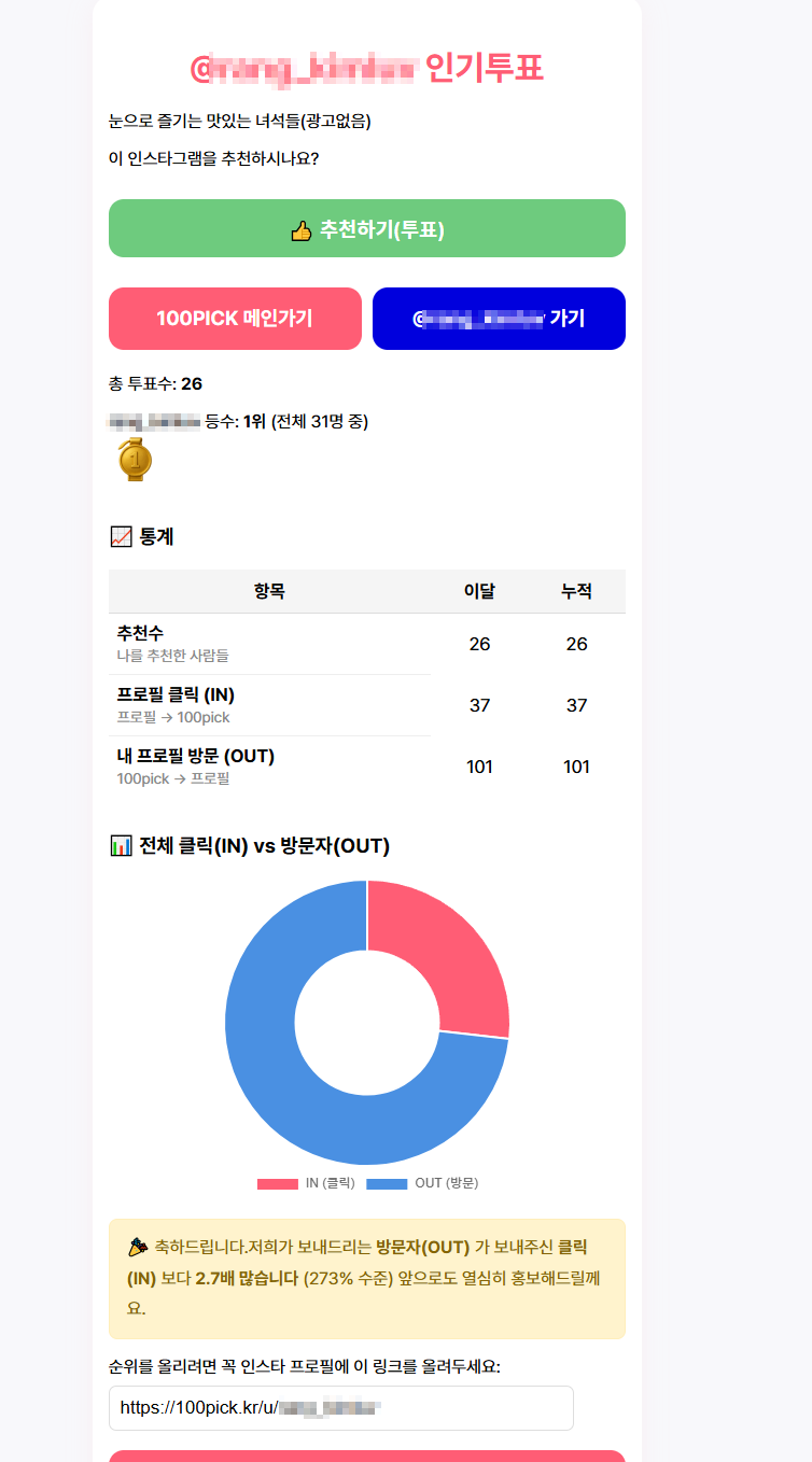 실제로 1위 사용자의 데이터는 100pick을 통해 2.7배나 많은 방문자를 얻고 있음을 증명해주었다.